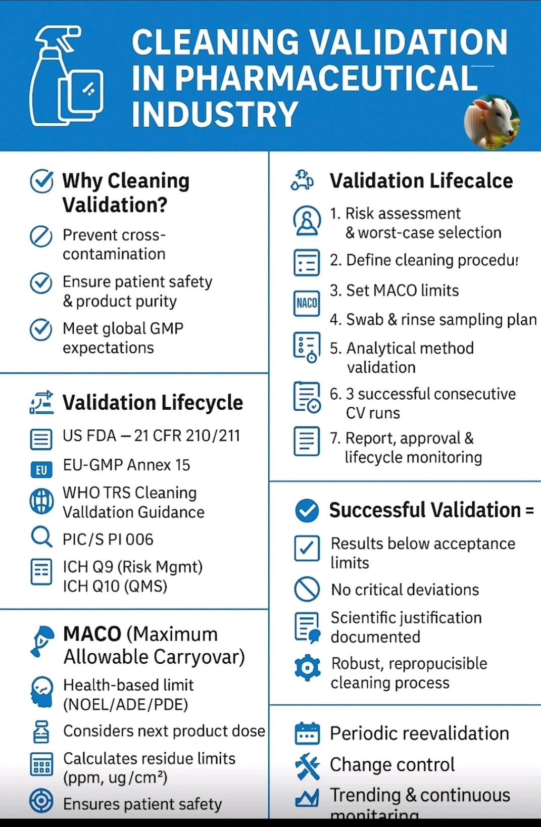 Cleaning validation guidelines provide a systematic approach to proving that cleaning procedures consistently and effectively remove product, cleaning agent, and microbial residues from equipment to acceptable levels. Key steps include creating a detailed validation protocol with a risk assessment, defining acceptance criteria, selecting worst-case products, establishing validated analytical methods, and performing sampling and testing (swab or rinse).