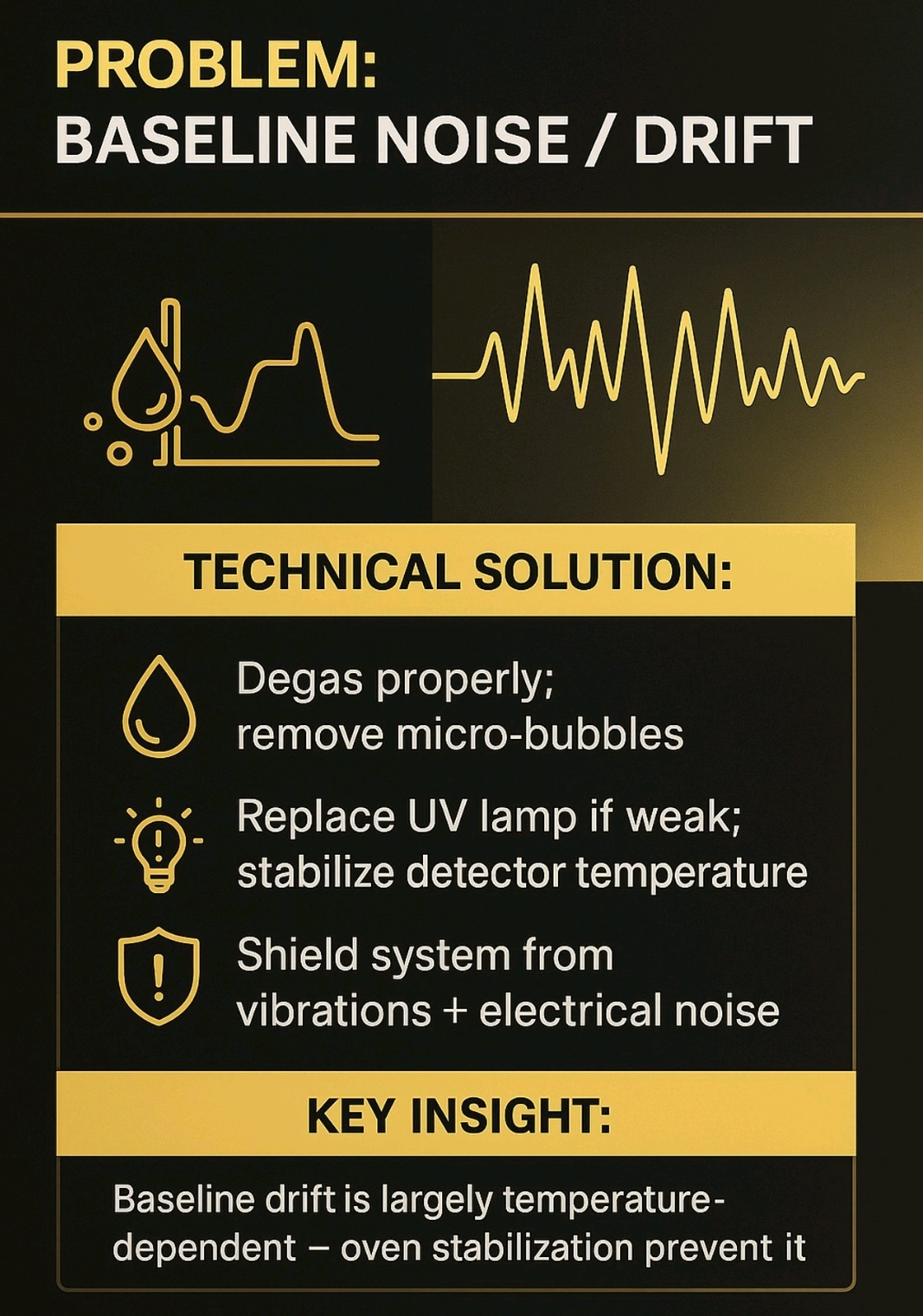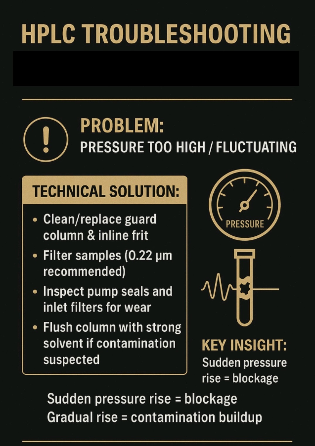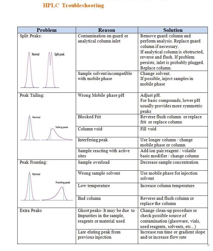 High Back pressure, Noisy baseline, carry over, Noise, Retention time (RT) shift, fronting, Tailing, Ghost Peak, low Resolution, Baseline Drift, Air bubble, Degassing, Buffer, pH, HPLC Column, Theoretical Plates, Frits, Mobile Phase, solvents, leakage, Injector, Lamp energy, calibration, Purge, flush, washing, filter,pump, blockage, C18,C8, storage, Flow, Normal phase, reverse phase, Needle, injector loop, composition, Gradient, Guard column, standard, sample, overload, concentration, system suitability, Methanol, Acetonitrile.
