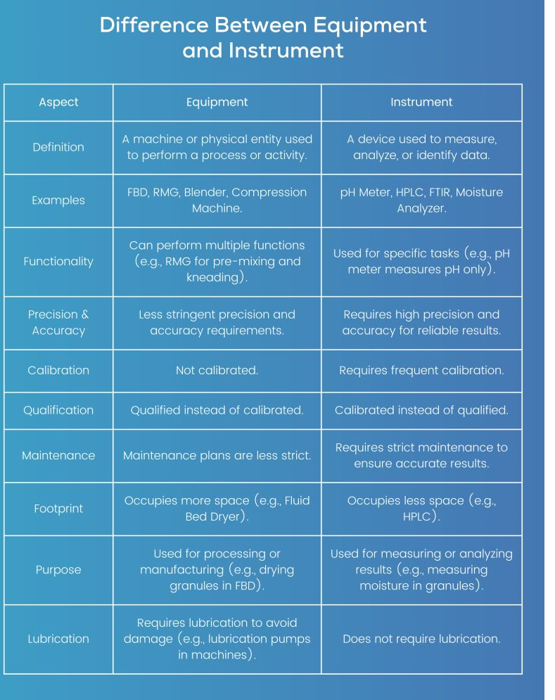 Instrument: is a more specific device used for precise measurement or analysis. Device takes a physical measurement and displays a value. (HPLC,FTIR,pH Meter)