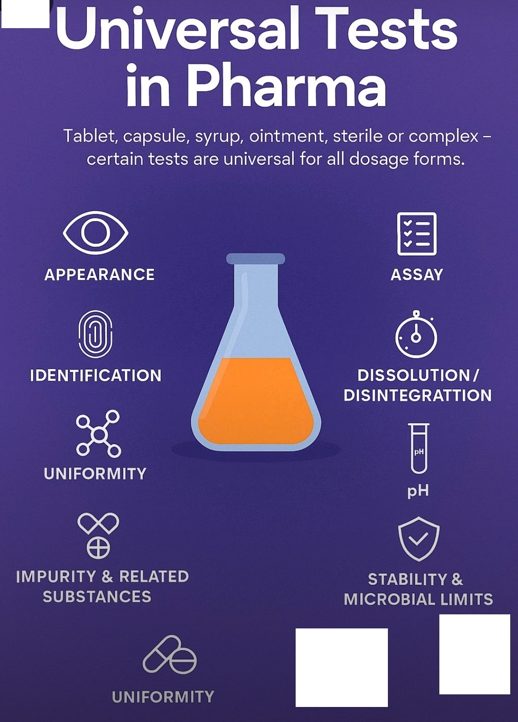 Description, Identification, Assay, DT, Dissolution, Impurities. Related Substance, Friability, Hardness, Average Weight, Content Uniformity, Microbial Limits, pH, Viscosity, sterility,.