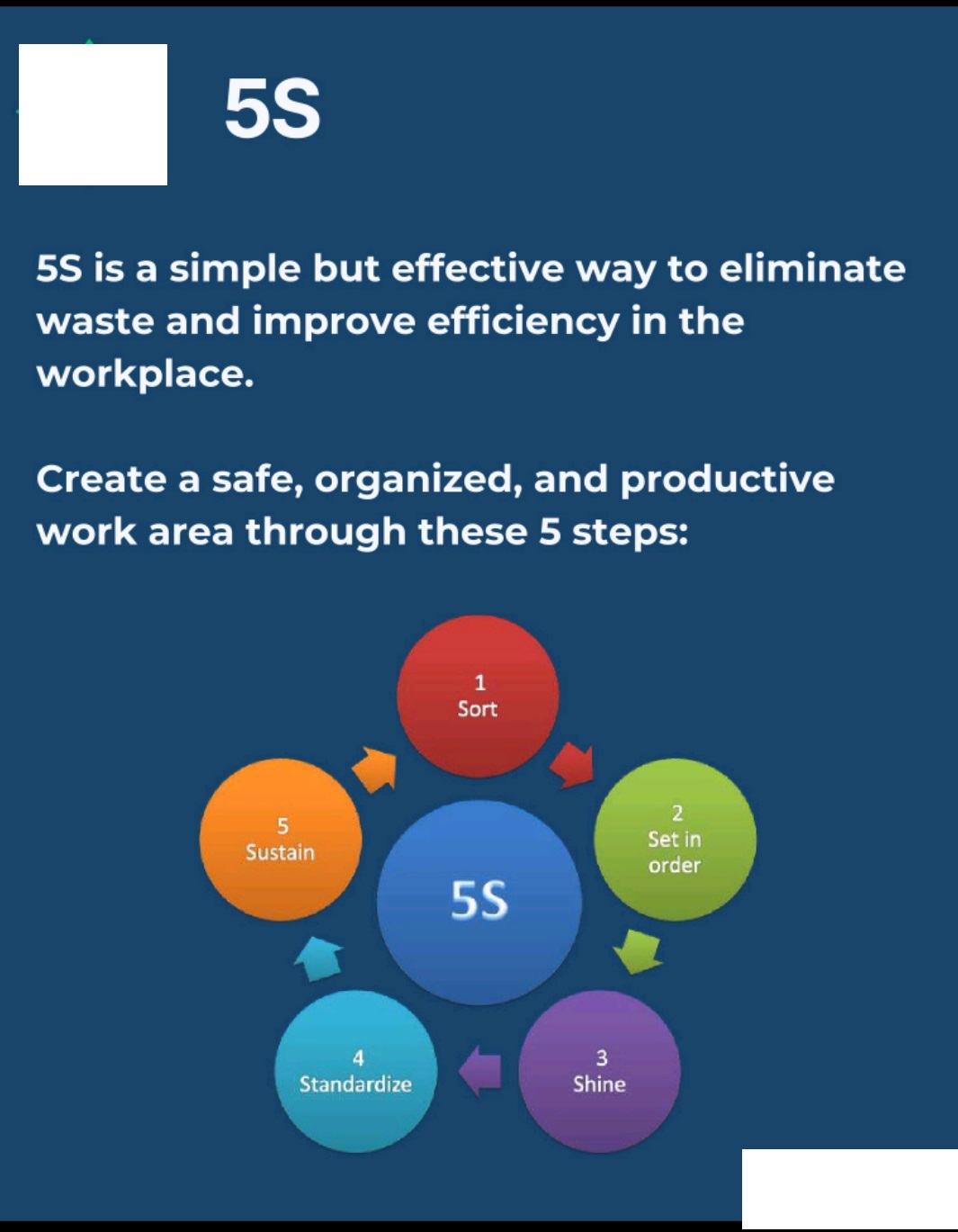 5. Sustain (Shitsuke): Develop the discipline to maintain the standards over time through audits, training, and management commitment, turning 5S into a habit.