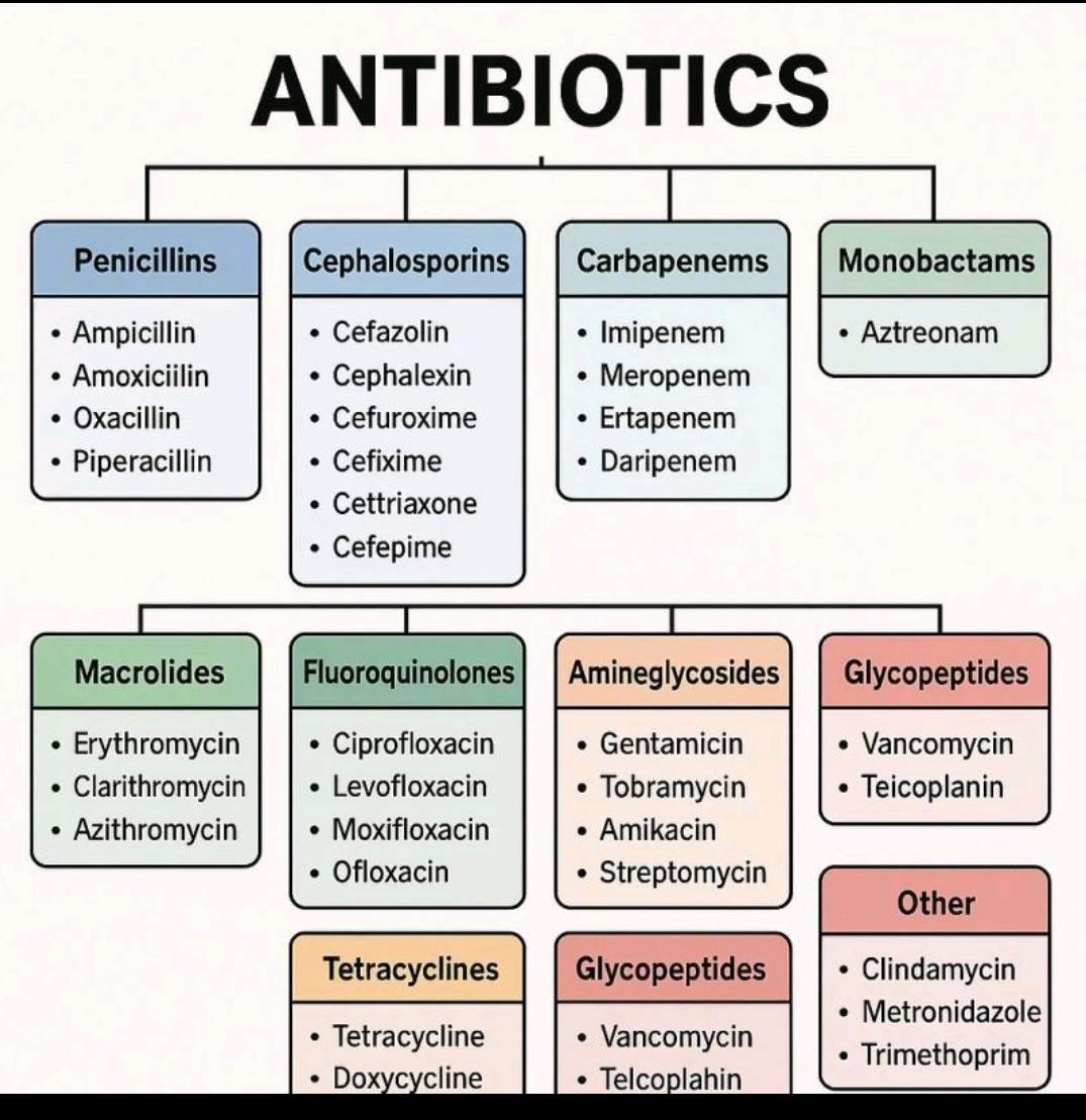 amoxicillin, ampicillin, cephalexin, cefazolin, azithromycin, erythromycin, ciprofloxacin, levofloxacin, doxycycline, minocycline, gentamicin, tobramycin, vancomycin, tetracyclines, macrolides