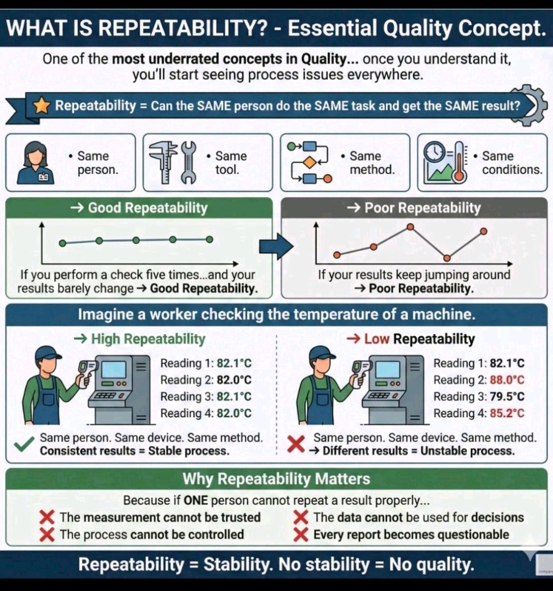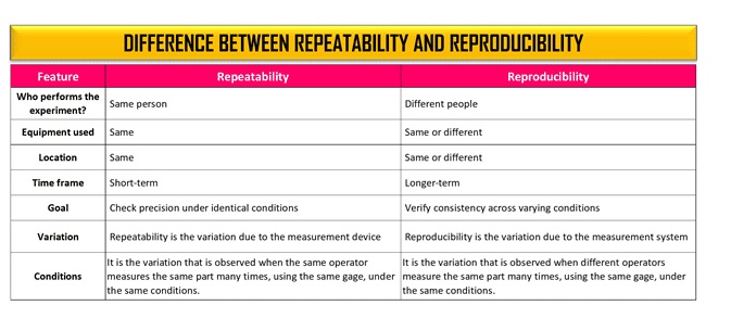 Repeatability is getting consistent results using the same method, same person, same equipment, same conditions, measuring short-term variation; while reproducibility is getting consistent results when different people use different equipment or conditions, checking long-term reliability and robustness across environments.
