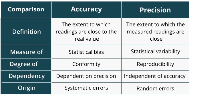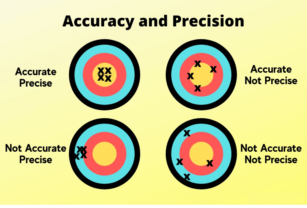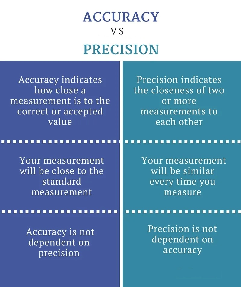 Accuracy is how close a measurement is to the true value, while precision is how close repeated measurements are to each other.