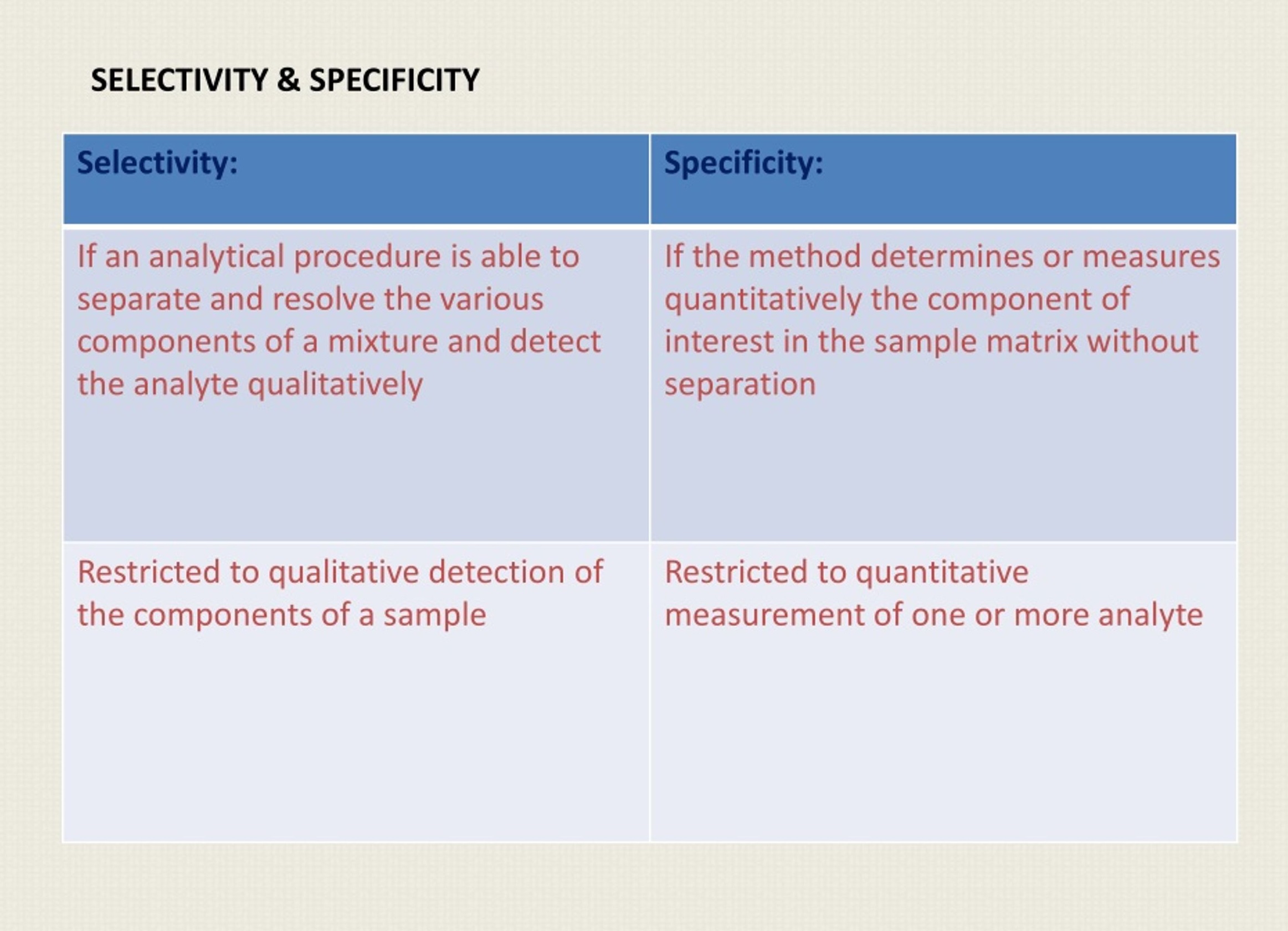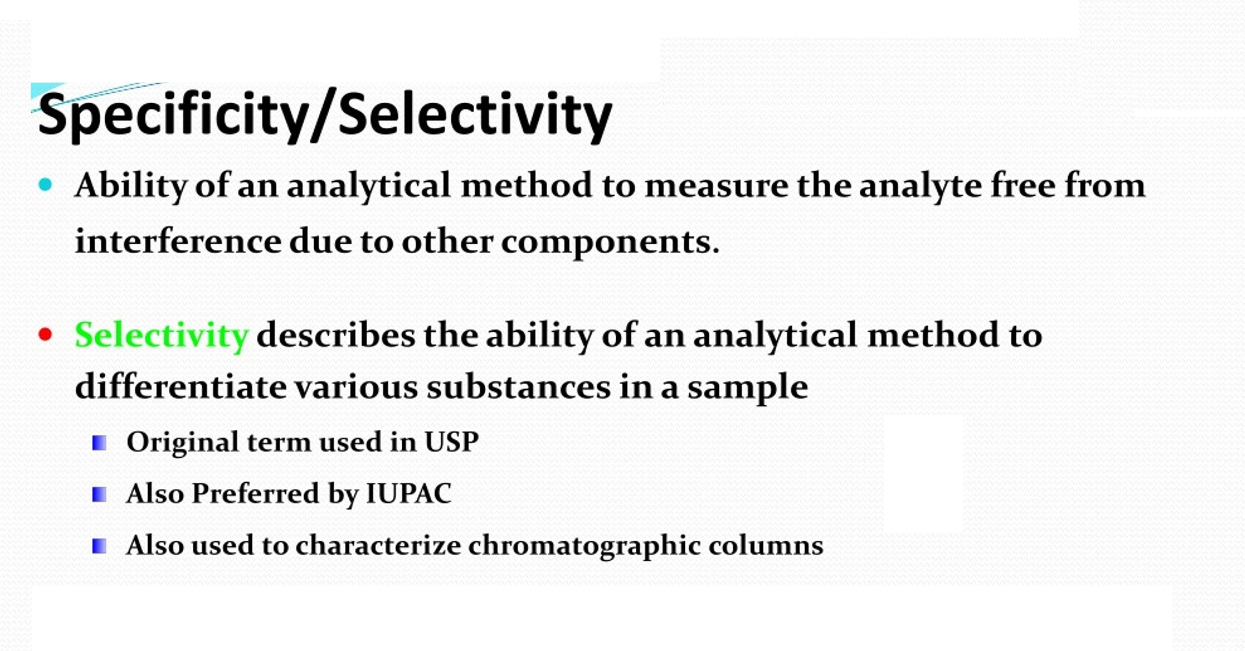 Specificity is the ability to measure the target analyte without interference from other components (impurities, degradants, matrix), while sensitivity refers to the method’s ability to detect and accurately quantify small amounts of the analyte, often defined by the Limit of Detection (LOD) and Limit of Quantitation (LOQ); and Selectivity (often related to Specificity but broader in analytical chemistry) is a method’s ability to measure one target analyte without interference from others.