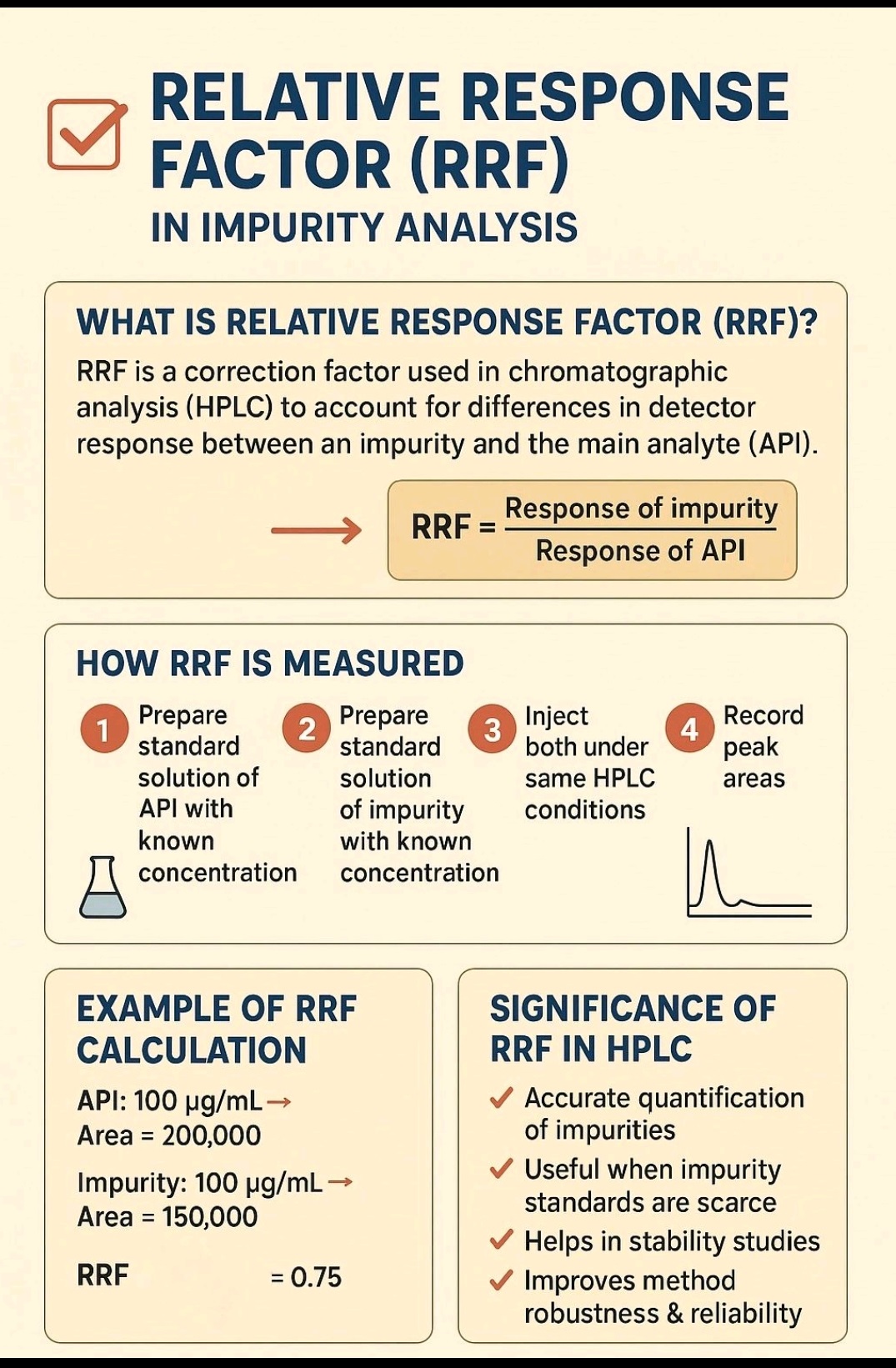 Relative Response Factor (RRF) formula compares the detector response (usually peak area) of an impurity to the main Active Pharmaceutical Ingredient (API) at equal concentrations, crucial for accurate impurity quantification; the core formula is
